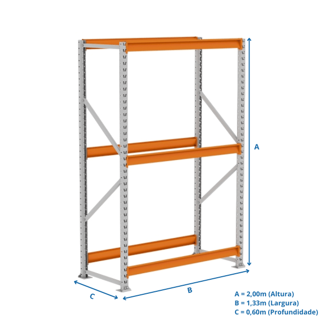Prático e versátil, além de ser de fácil montagem. Dispensa o uso de empilhadeiras, onde as mercadorias são depositadas e retiradas manualmente dos planos, que podem ser com bandejas de aço ou madeira. Produzido em aço resistente, com capacidade de 250kg por nível e reforço nas laterais é indicado para depósitos, estoques e exposição, como: pet shops, oficinas, lojas de materiais de construção e mini atacarejos.